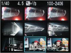 回放模式下,整屏一次最多可以显示九张照片的缩略图。每张照片的拍摄参数一目了然,无论是快门、光圈、曝光补偿、对焦模式这些比较常见的,还是直方图、RGB参数等不常见的,都可以找到。