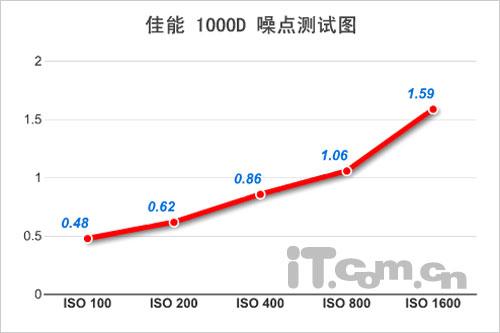 定位入门单反的佳能1000D最高感光度为ISO 1600,但其在对噪点的控制上表现良好。下面是ISO 100-ISO 1600各档感光度的噪点值图,1000D最低感光度ISO 100的噪点值低至0.48,最高感光度ISO 1600的噪点值为1.59。随着感光度的提高,噪点值的上升速度也处于一个合理的水平。在高感光控噪表现上,1000D能较好地表现出数码单反的优势,配合其防抖套机镜头的使用1000D可应付各种弱光环境的拍摄需求。
