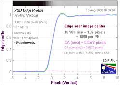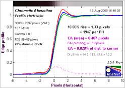 佳能在成像色散控制方面一向让人放心,这次1000D的表现也不俗。测试结果,1000D成像中央色散值为0.0572 pixels,边缘色散值为0.407 pixels,色散极为轻微。而在镜头广角端或长焦端,色散情况会相对明显一些,尤其是在逆光的情况下。