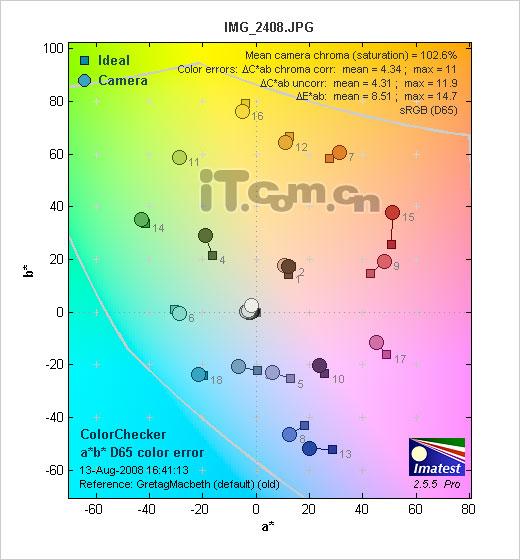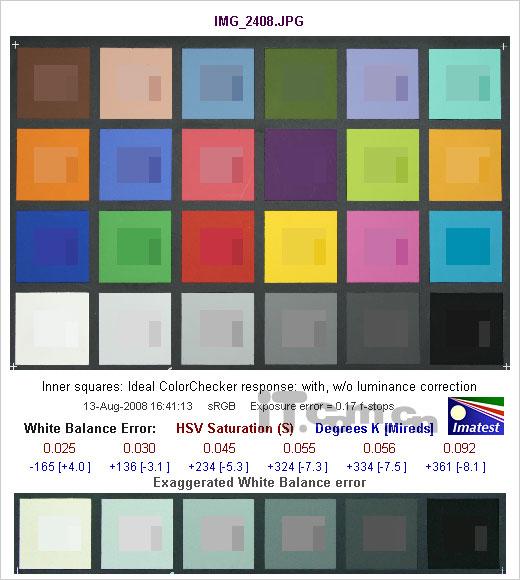 在色彩上佳能单反的风格以自然为主,色彩饱和度并不高。对1000D的色彩测试也充分体现了这一点,其平均色彩差异值为102.6%(100%为标准),各主要色彩中就红色的倾向表现相对大些。而在色彩差异测试图中1000D的成像色彩和色版的原始色彩也较为接近,在最后一部分的白平衡还原测试,1000D的成像色彩轻微偏绿。