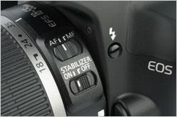 镜头侧面有两个开关,靠上位置是手动对焦和自动对焦切换,下方是防抖功能开关。EFS 18-55mm 1:3.5-5.6 IS镜头所采用的是一种新的“模拟反馈系统”,与现有的IS防抖系统一样有效,效果相当于提高最多4档快门速度,同时能自动判断拍摄场景所需的防抖模式,在普通防抖和追随防抖两种模式中切换,有效解决因手抖造成的影像模糊问题。