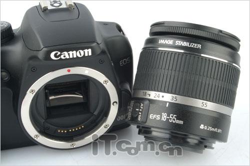我们此次拿到1000D的套机,所配备的镜头是EFS 18-55mm 1:3.5-5.6 IS,其镜头上标有“IMAGE STABILIZER”字样,代表运用了佳能IS防抖技术。安装在佳能1000D上焦距相当于28.8-88mm,光学结构是9组11枚镜片,其中包括1片非球面镜片,前组镀膜的运用,对于控制眩光有很好的效果。镜头的最近对焦距离是0.25米,图像放大率是0.34倍。