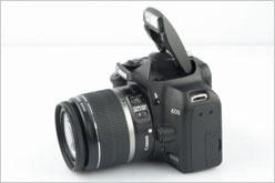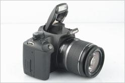 闪光灯开启键位于闪光灯的侧面,其下方为景深预览键。佳能1000D的闪光灯抬起高度比较理想,辐射范围比较广,配合内置多种闪光模式,基本满足家庭用户的需求。顶部的热靴接口,兼容佳能任何一款外置闪光灯。