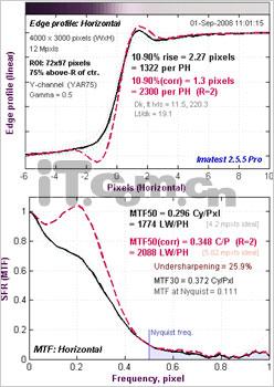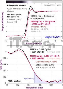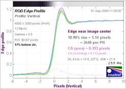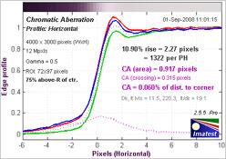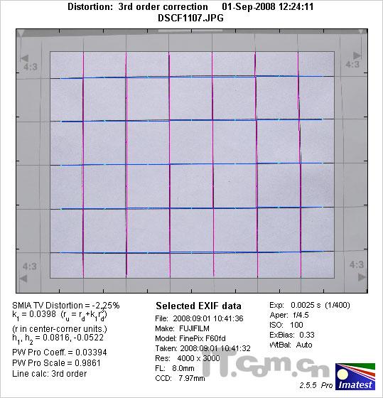 F60fd成像中央色散值为0.393 pixels,边缘色散值为0.917 pixels,对于色散的控制表现理想,两者都在让人满意的范围内。对色散的控制和镜头的质素有较大关系,看来富士的富士龙镜头还是不错的。