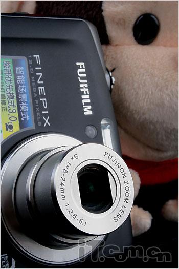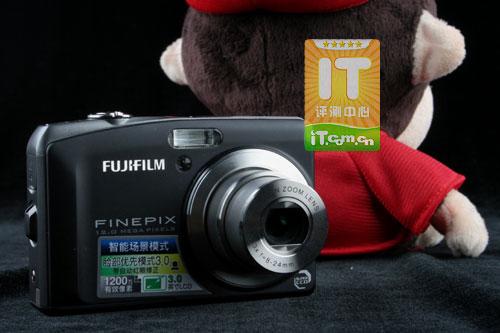 拆开样机的包装,如果没看到正面张贴的特征标签,还真以为拿到的是F50fd,两代产品在造型设计上如出一辙,我们特别查阅了资料,对比了它们的体积和重量,果然不出所料,体积完全相同,重量上F60fd稍重8克。我们此次拿到的是黑色样机,F60fd还有银色款,其机身外壳经过磨砂处理,采用金属材质,握机手感相比塑料外壳显然天壤之别。虽然机身体积和卡片机相比稍显厚重,但放在口袋中,并不感觉累赘。机身正面,镜头占据了近二分之一的空间,镜头环经过抛光处理,在黑色机身的衬托下特别突出。镜头左上角为闪光灯和对焦辅助灯,闪光模式方面,F60fd具有的“智能闪光”功能,可自动调节闪光灯的输出量以达到最佳的闪光效果。这种智能闪光控制技术可识别场景条件,并判断出合适的闪光灯输出,对过曝和欠曝的控制比较到位。