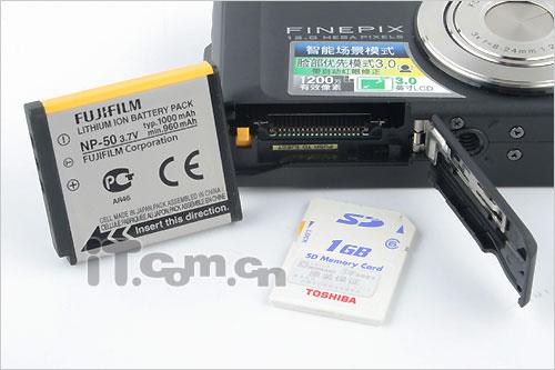 供电方面,采用的是一块标值1000mAh、3.7V的NP-50可充式锂电池,由于显示屏幕的尺寸增大,所以相比F50fd,续航时间稍短了一些,大约可以拍摄200张照片。存储方面,内置25MB空间,采用xD/SD卡双存储介质插槽,支持SDHC卡,用户可以方便的根据自己的喜好在存储介质间选择。当然,目前SD卡的性价比更高,一张2GB容量的SD卡,市场售价在80元左右,在最大分辨率、最精细模式下,大约可以拍摄421张照片。