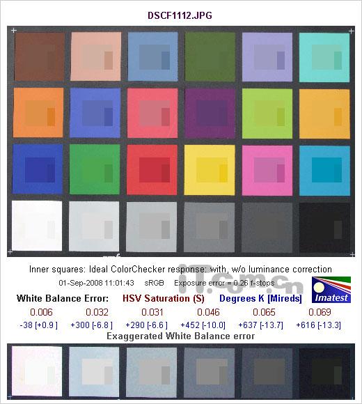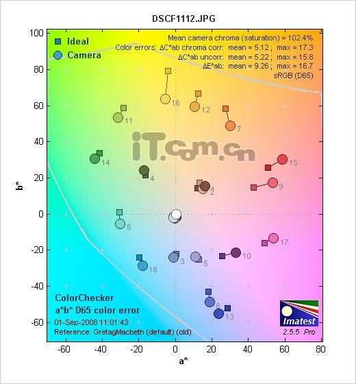 下面是两张关于色彩测试的图片,被测试图像是用ISO 100拍摄的。根据软件分析得F60fd的成像色彩平均差异值为102.4%,整体色彩差异不大。从几大主要色块来看,黄色的偏离比较大(图中圆圈表示为相机的成像色彩,方形为色版原始色彩),其他部分的倾向都不太明显。在色彩差异测试中,F60fd对色彩还原比较忠实自然,最后的白平衡还原测试中F60基本没有出现偏色的现象。