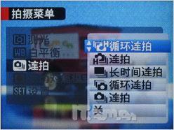 更多的拍摄参数需要进去菜单设置,其中值得一提的是富士F60fd的连拍模式,F60fd具有5种不同的连拍模式:包括最初3幅连拍、最初12幅连拍、最后3幅连拍、最后12张连拍和长时间连拍。连拍速度最快可达到5张/秒。