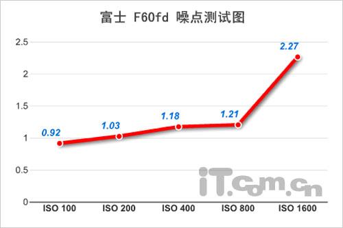 富士F系列数码相机在控噪方面出名优秀,看看这次1200万高像素的F60fd会否给富士制造难题。我们对F60fd各档感光度的成像进行测试得出噪点值,ISO 100-ISO 800下F60fd的噪点值表现非常平稳,基本在1.00左右对噪点控制较为理想。而在ISO 1600下噪点值有明显的上升达2.27,这将为成像带来明显的信噪干扰。从测试结果分析,将相机感光度设置在自动(ISO 800)是比较实用的。