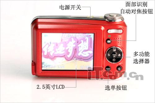 相机的背面是2.5英寸15.4万像素液晶显示屏,相对于时下流行的3.0英寸或3.5英寸的大屏幕来说,略显得有点小气。屏幕像素较低,但显示效果比较逼真自然。右边依然是操作按键,比较有特色的是独立设计了面部识别自动对焦按钮,充分考虑到家庭用户常用于聚会,人像拍摄等场景,设计相当人性化。按键采用胶质设计,不够高档。