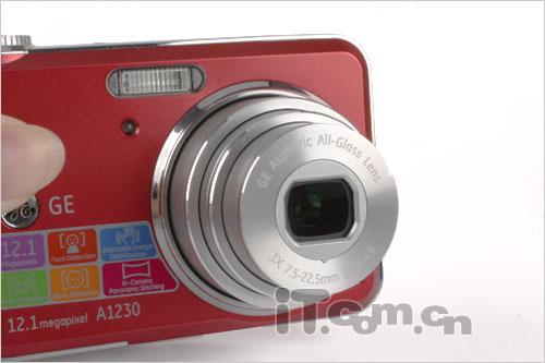 相机正面,3倍光学变焦镜头占据半壁江山,镜头采用三段式设计,同时稍微给人笨拙的感觉。出于成本考虑,镜头并没有使用金属工艺,只是普通的塑料材质,可看上去依然比较光滑大方。镜头上面是闪光灯和麦克风,左边是黑色的GE标记。整体来说,通用A1230的正面设计比较简洁。