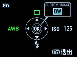 在拍摄状态下按下宾得K20D的Fn键,就会激活方向键上的快捷键功能,分别可以对驱动模式、白平衡、ISO和闪光灯进行调整,而中间的OK键则会变成进入对拍摄的色彩风格进行设置。