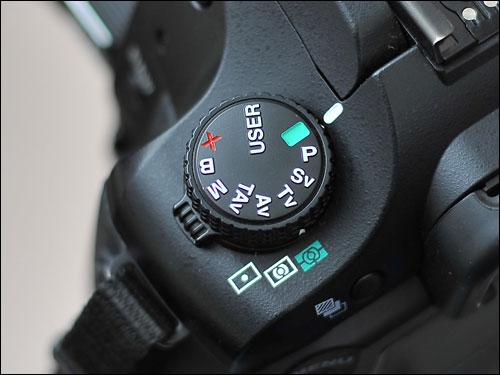 宾得K20D的拍摄模式和一般的数码单反一样,拍摄模式的选择安排在了机顶的模式转盘上面,通过旋转这个转盘,我们就可以方便快捷地切换拍摄模式了。