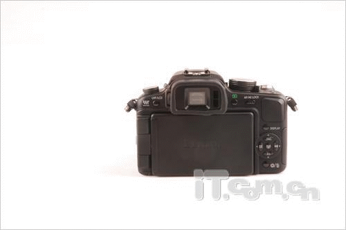背面,最显眼的就是那块3.0英寸双轴可自由旋转的46万像素LCD显示屏。由于取消了反光板,可以像使用消费数码相机那样取景,还能自动或手动对焦,所以相比传统单反相机,取景优势不言而喻,并且这块屏幕可视角度大,显示效果极佳,还能自动增亮,出乎了我们的意料。在拍摄时更突出的是其可自由旋转设计,让用户可以轻松地进行各种角度的取景;平时闲置的时候,可以把屏幕反向,起到保护的作用。