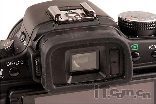 LCD显示屏上方是一块100%视野0.7倍放大倍率的14.4万像素EVF取景器,清晰度很高,内置眼启传感器,当眼睛贴近EVF时,会自动开启,并关闭LCD,当眼睛离开时,会自动关闭EVF并开启LCD,这功能可以在菜单中设定。