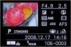 这块有点跟单反类似的,在LCD上显示相机参数信息,之前尼康D40还可以使用自己的照片做背景呢。松下G1为用户提供3种样式的显示方式,拍摄信息一目了然非常清楚。