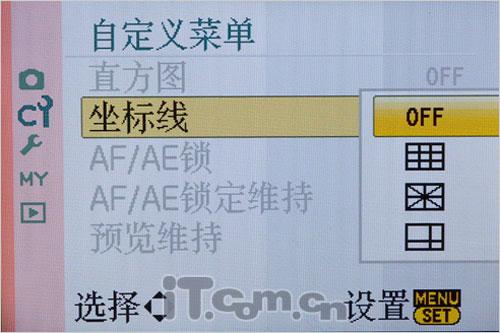 和一般DC提供的“井字”坐标线不同,G1提供3种选择,井字、米字和十字,其中十字坐标线也是可以根据自己的需要调节位置的。这么细致的功能是否真正能用的上暂时不讨论,不过从这点上或许能看到松下的态度。