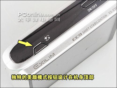 独立的美颜模式按钮,是卡西欧Z300上特有的,这样便可以更加随心地进行创作了。同时我们也可以看到,机顶印有的CCD SHIFT STABILIZATION,表明卡西欧Z300是一台拥有CCD位移式光学防抖功能的机型。