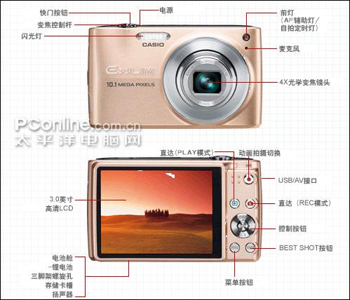 卡西欧Z300采用了一块1/2.3英寸的CCD作为感光元件,有效像素为1010万,搭配了一枚4倍光学变焦的镜头。整体外型采用了带有弧度的卡片机造型,简约与纤细的设计风格给人时尚的美感,其金属材质的外壳既结实而又充满时尚感。