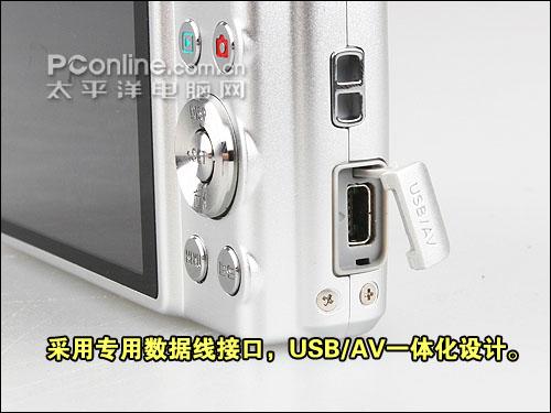卡西欧Z300的传输接口设计在机身右侧,为专用接口所以通用性有所欠缺。USB和AV一体化的设计可以简化机身传输接口的设计。