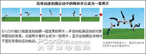 卡西欧的数码相机向来以特色功能为卖点,在卡西欧Z300上我们可以应用到一个新颖的拍摄模式进行创作——运动轨迹模式。该模式下,相机能够以高速连拍拍摄一组连续运动的照片(最多5张),并且能自动检测出运动的主体并勾勒出来,然后合成在一张300万像素的照片上。