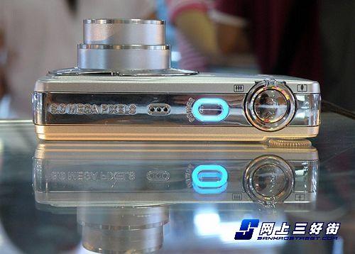 爱国者数码相机有着时尚的外观设计,正面看有点像佳能IXUS75,背面看有些像索尼的W系列产品,爱国者T60的机身顶部设计了电源开关与快门按键两个按键,电源开关被蓝色的环形灯包围,开机时看起来很漂亮。T60快门外围被变焦拨杆包围,在进行变焦操作时,相比拨杆设计感受会更加灵活方便。爱国者T60的外观尺寸为92.5mm x 58 mm x 19.9mm,重量仅为125g,随身携带非常方便。
