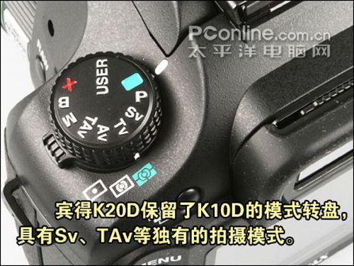 宾得K20D的模式转盘依然保留Sv(感光度优先)、TAv(光圈快门优先)和X(闪光灯同步)等模式,这些独特的为数码影像而设的模式带给用户全新的体验。模式转盘下方是测光方式拨杆,方便用户切换测光方式。