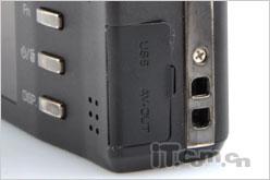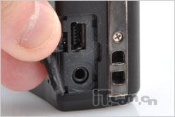 理光CX1的接口并没有设计在机身底部,而是隐藏在侧面,翻开橡胶垫片,可以看到了mini USB和AV OUT两个接口。