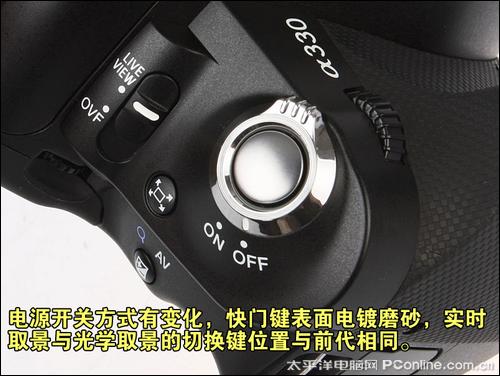 重新设计外形的索尼A330,将开关从机身的左侧移到了快门位置,开关机更顺手,同时快门键摈弃了抛光表面而采用电镀磨砂质感,除了质感更强烈以外,还不容易留下油渍。