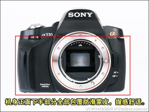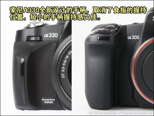 索尼A330是今年索尼发布的三款单反当中的一款,针对入门用户作了较为全面的修改,而外观方面也与上一代有较大的差别。手柄的设计是一个亮点,但同时也是争议最多的一个地方,短小的手柄并不适合手掌大的人使用,同时握持时也闲置了食指,这样的设计更适合女性用户,机身大面积包裹防滑蒙皮也表明了它是一款适合使用实时取景双手握持方式的单反相机。