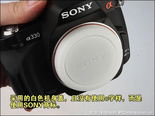 索尼A330定位于入门单反相机,所使用的机身盖为白色,上面印的logo并非索尼单反一贯使用的α字样,而是使用SONY的商标,白色的机身盖与机身显得十分不配,也显得低廉,索尼在A330上使用这样的机身盖,一定程度上降低了整体的档次。