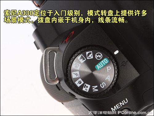 索尼A330的模式转盘设计同样作了修改,内嵌于机身内,保持了机身的线条,同时,模式转盘上的场景模式更为丰富,配合使用高速自动对焦的实时取景功能,可以获得与消费相机类似的操作感受,对于入门用户来说更易接受。