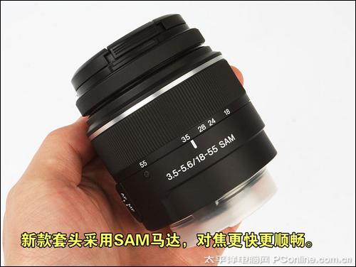 索尼新款单反搭配的是全新推出的套机镜头DT 18-55mm F3.5-5.6 SAM,焦距以35mm规格换算为27-82.5mm的3倍变焦镜头,采用7枚圆形光圈叶片,镜片组合为7群8枚,其中包含2枚非球面镜片、以及1枚ED镜片。由于SAM的搭载,有更为顺畅的对焦性能。在镜身上具有AF/MF切换按键。滤镜口径为55mm,重量为210g。