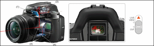 索尼A330沿用了索尼引以为豪的高速自动对焦实时取景设计,采用可变角度的五面镜以及辅助传感器实现实时取景,可以使用原有的对焦模块,故对焦速度在目前单反实时取景功能当中是最快的。使用实时取景的时候还可以进行1.4倍及2倍的对焦点放大。由于使用的是辅助传感器显示取景画面,所以画面比其他直接使用主传感器实现实时取景功能的单反相机要粗糙不少,可谓有得有失。