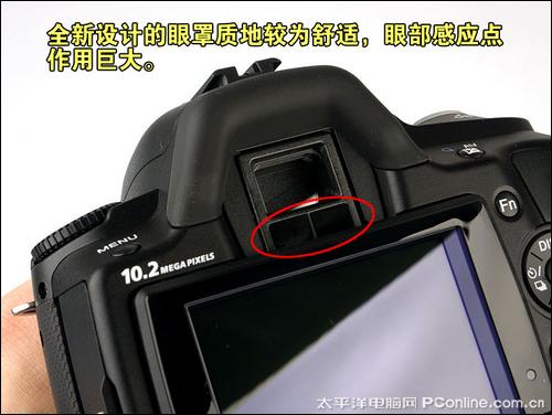 索尼A330眼罩采用全新的设计,质地柔软舒适,流线型设计,与机身线条配合更为紧密,取景器保持了95%的视野率以及0.74倍的放大倍率,由于五面镜结构的限制,0.74倍的放大倍率相比较主流入门单反0.85倍以上的放大倍率显得较为落后,取景器下的眼部感应点作用巨大,专为入门用户设计的功能有不少需要与眼部感应点相配合。