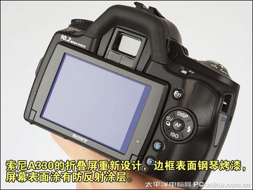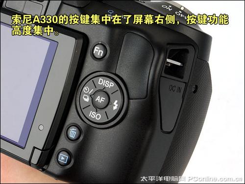索尼A330的按键布局有较大的改变,显示屏的左侧按键取消,不少功能整合于右边的五维方向键上,这一点与消费相机相类似,针对入门用户设计,更易上手,但对于习惯使用单反的人来说,不少功能需要进入菜单设置,较为繁琐。