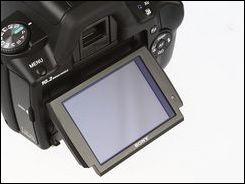 索尼A330保留了A300上的折叠屏设计,2.7寸23万像素TFT显示屏,虽然参数并不高,但是足够实时取景以及各种设置的需要。显示屏的边框采用了钢琴烤漆表面,足够闪亮,但同时也比较容易留下划痕,使用的时候值得注意。屏幕可进行上翻90度,下翻55度的角度变换,且支架采用金属制造,耐用性上有提高。但折叠屏设计在竖拍取景的时候并没有优势,相比较尼康D5000的旋转屏设计还是有一定的局限。