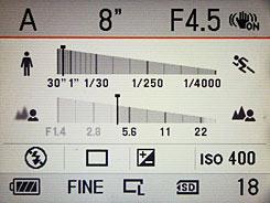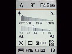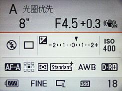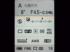 索尼A330采用了全新的拍摄界面,带有新型图标显示界面,简单易懂,通过形象的图形表现快门与光圈会对成像效果起到怎样的影响,在开启闪光灯的时候,更会通过颜色区别可用的快门速度范围,对于单反相机刚上手的用户来说,比较实用。重力感应功能可以快速自动切换横纵显示方式,较为人性化。