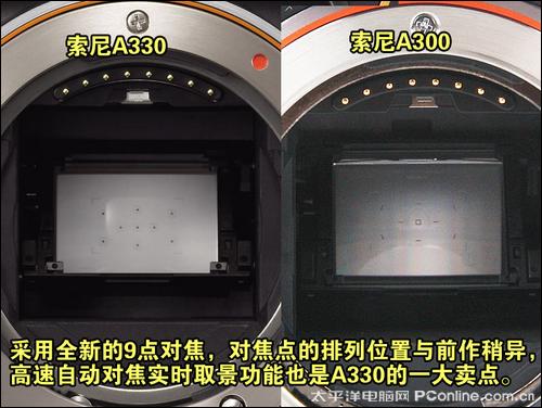 索尼A330采用了全新的9点对焦,对焦点的位置稍作调整,沿用了索尼引以为豪的五面镜设计实现实时取景功能,实时取景时可以使用原有的对焦系统实现高速对焦,使得获得消费DC操作感受的同时,拥有单反一般的对焦速度。而像素依然维持了上一代的1020万,在目前入门单反整体水平上升的大环境下,稍显落后。