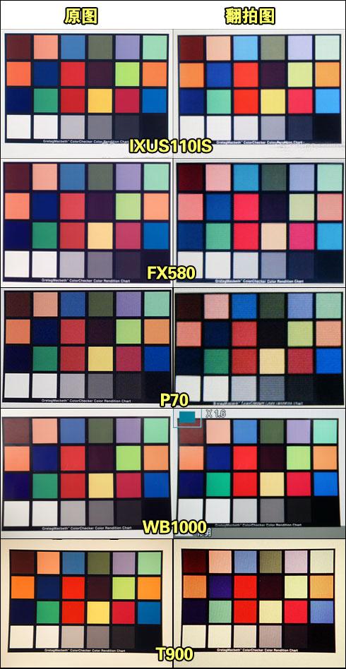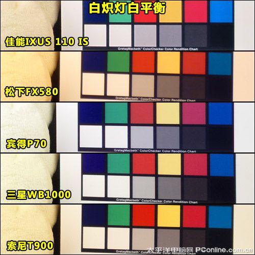而在白炽灯白平衡的测试中,我们看到佳能IXUS 110 IS、三星WB1000和宾得P70都比较准确地还原出了原来的色彩,而松下FX580和索尼T900则仍然表现出偏黄的现象。