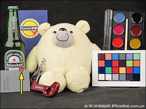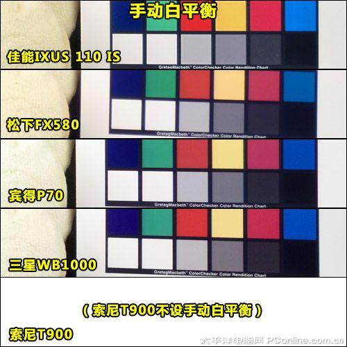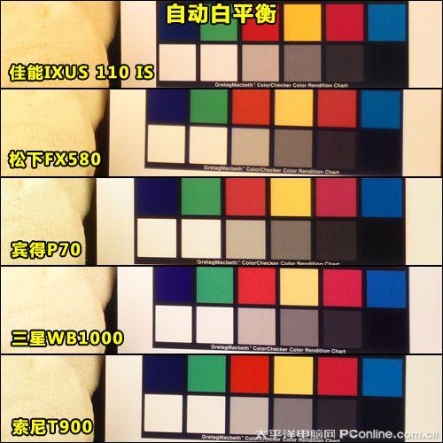 在标准白炽灯光源下,一般相机的自动白平衡都会有一定程度的偏黄,而在这里,我们对各机的自动白平衡的还原能力进行了测试,结果表明了它们之前还有着比较明显的差异的。其中表现最好的是三星WB1000,偏黄的程度最小,其次是索尼T900和宾得P70,最后是松下FX580和佳能IXUS 110 IS。
