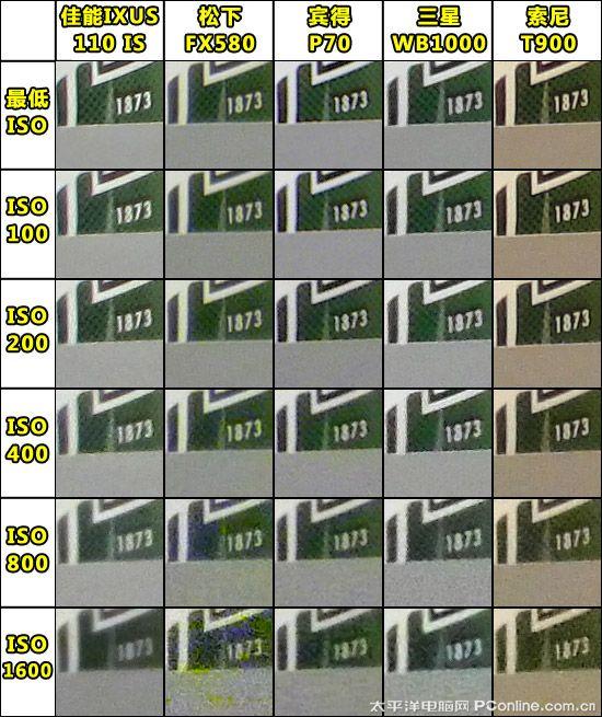 在ISO 1600时,松下FX580的画面已经被严重影响,利用率很低。其次是三星WB1000和宾得P70,佳能IXUS 110 IS虽然噪点没前者严重,但画面细节却丢失得比较多。