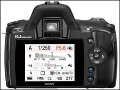 索尼α230采用了全新的拍摄界面,带有新型图标显示界面,简单易懂,通过形象的图形表现快门与光圈会对成像效果起到怎样的影响,在开启闪光灯的时候,更会通过颜色区别可用的快门速度范围,对于单反相机刚上手的用户来说,比较实用。重力感应功能可以快速自动切换横纵显示方式,较为人性化。