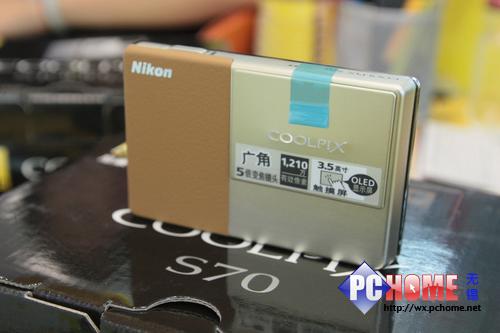尼康S70 机身厚度仅有 20mm 厚,相机正面采用滑盖式设计,机背搭载了一个3.5 ? 28.8万像素 Touch OLED,外形非常讨好。采用了一片 1/2.3 英寸 1210 万像 CCD 元件,支持最大分辨率 4000×3000 ,并且支持16:9拍摄。配备了一支 28-140mm 的五倍光变潜望镜头,并内置了 VR 防震,提供 f/3.9-5.8 最大光圈。