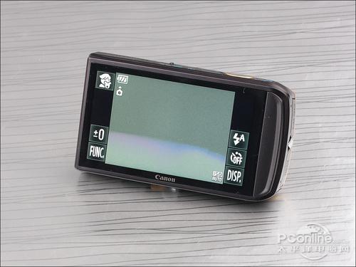 佳能使用全触摸屏操作的设计,IXUS 210还是第一台,屏幕尺寸为3.5英寸,显示面积较大,所以也提供了较大空间设置功能按键,触摸屏为电阻式,通过手指尖也可以进行操作,但触摸屏的反应并不算灵敏,尤其是在滑动屏幕操作的时候,更显得十分迟钝。而整机反应相当不错,并没有感到不流畅。