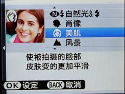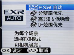EXR自成一档,可以选择EXR自动、分辨率优先、高ISO&低噪音和D-范围优先四个模式,菜单显示明确。S205EXR还提供自然光,自然光闪光、强化弱光拍摄、强化主体对焦、人像、美肌、夜景、日落、雪景等17种场景模式。