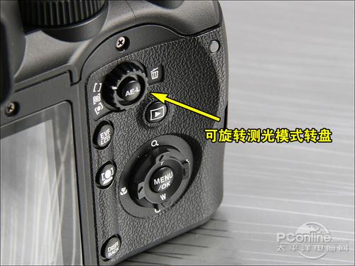 机背右则的主要功能按键则比较传统,相对前作变化不大,除了一般的DIS、菜单、方向按键外,最主要的还是与镜头对焦模式功能转盘一样的测光模式转盘。可以方便地旋转选择不同的测光模式。