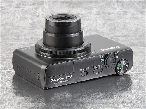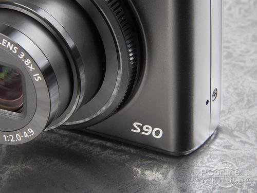 外观上,佳能S90的变化也是比较大的,起码第一眼看到外观,如果没有大大的型号印在边角上,恐怕笔者是怎么也不会猜它是S系列的机型。毕竟佳能的S系列从S30开始就已经是滑盖设计了,之后一直到佳能S80的时候也没有变过,这次佳能S90一改从前的滑盖设计,变回了最传统的方形设计,镜头外圈上设计了一个可供用户转动的转环,用以调整拍摄参数或其它操作。
