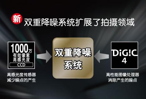 佳能最新技术的1000万有效像素高感光度CCD可以减少噪点的产生,同时高性能的DIGIC 4影像处理器可以有效消除产生的噪点,二者精妙融合,组成了强大的双重降噪系统。在双重降噪系统的处理下,所拍摄图像中的噪点大大降低,使图像画质得到提高,因而使用者可以放心使用更高的感光度进行拍摄。除此之外,该系统使得照片的动态范围明显提升,尽可能多地保留画面中的高光层次和暗部细节。