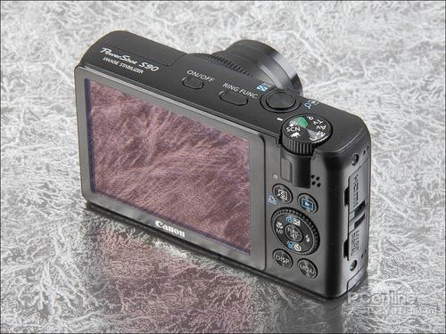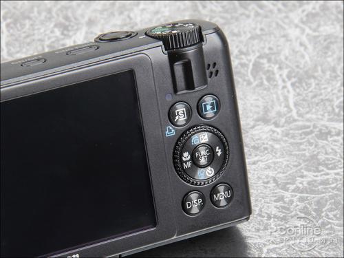 背部面板还是佳能一贯的设计风格,并没有太大的改动,方向键外围的转盘设计为无级数,转动起来平滑无比,阻尼也小得几乎没有,所以在操作方向键的时候容易误转动这个转盘。